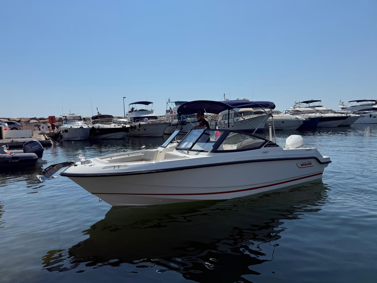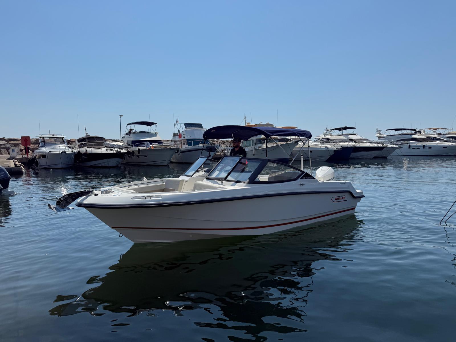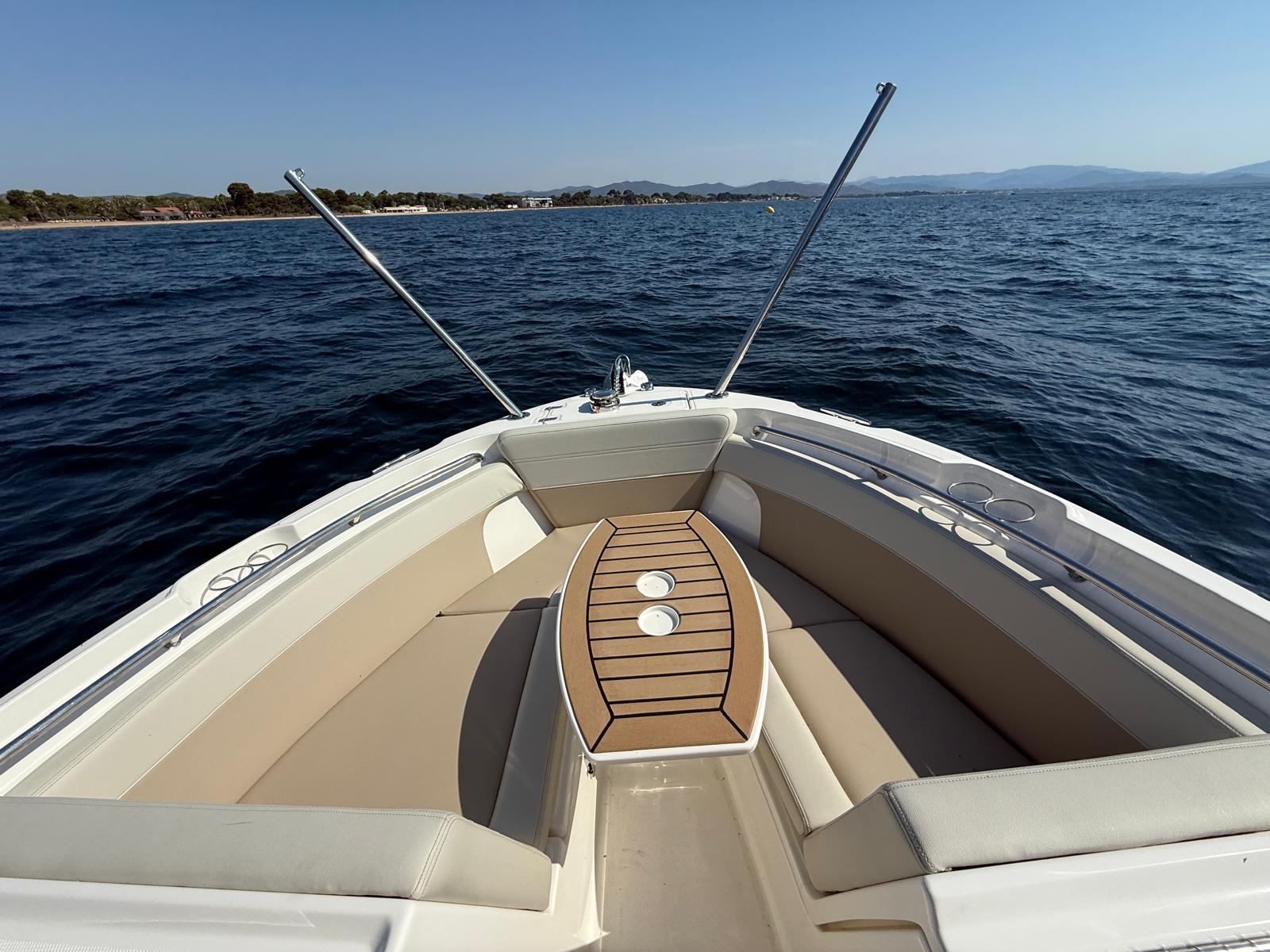 Couleurs : gel coat blanc ; moteur blanc, logos rouges, tauds bleu marine