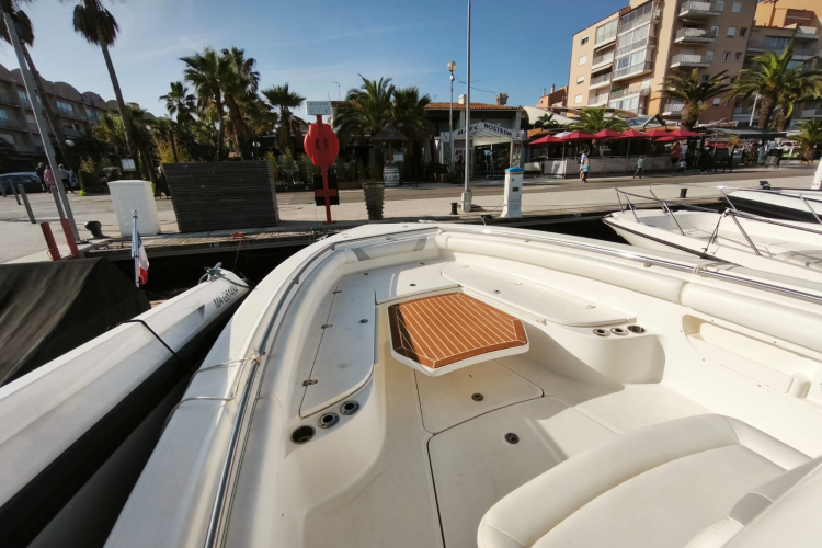Configuration : coque open, grande console centrale avec WC et douche, grand bain de soleil avant.