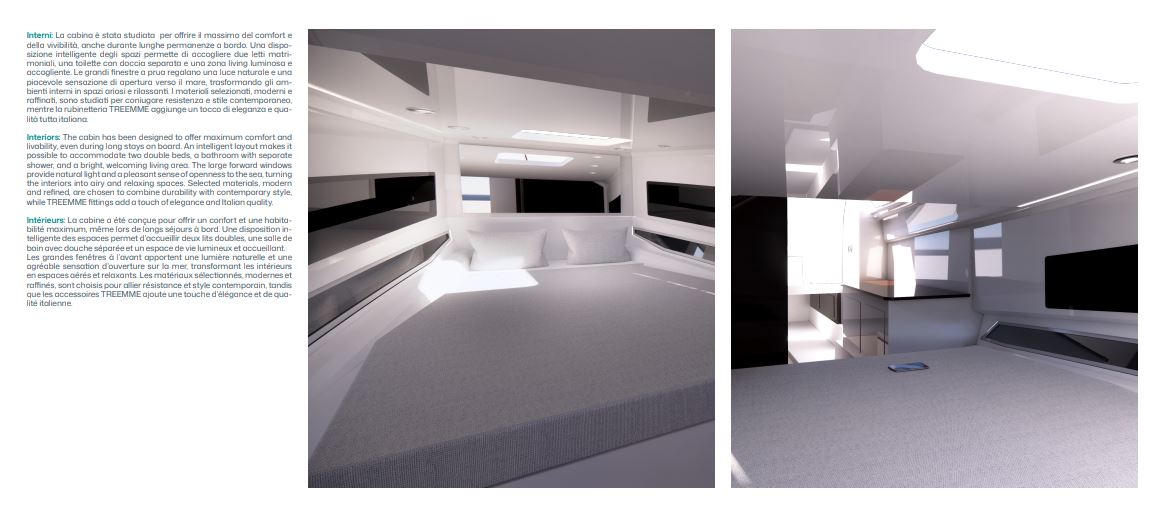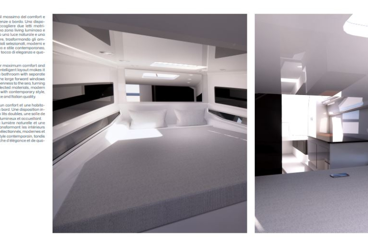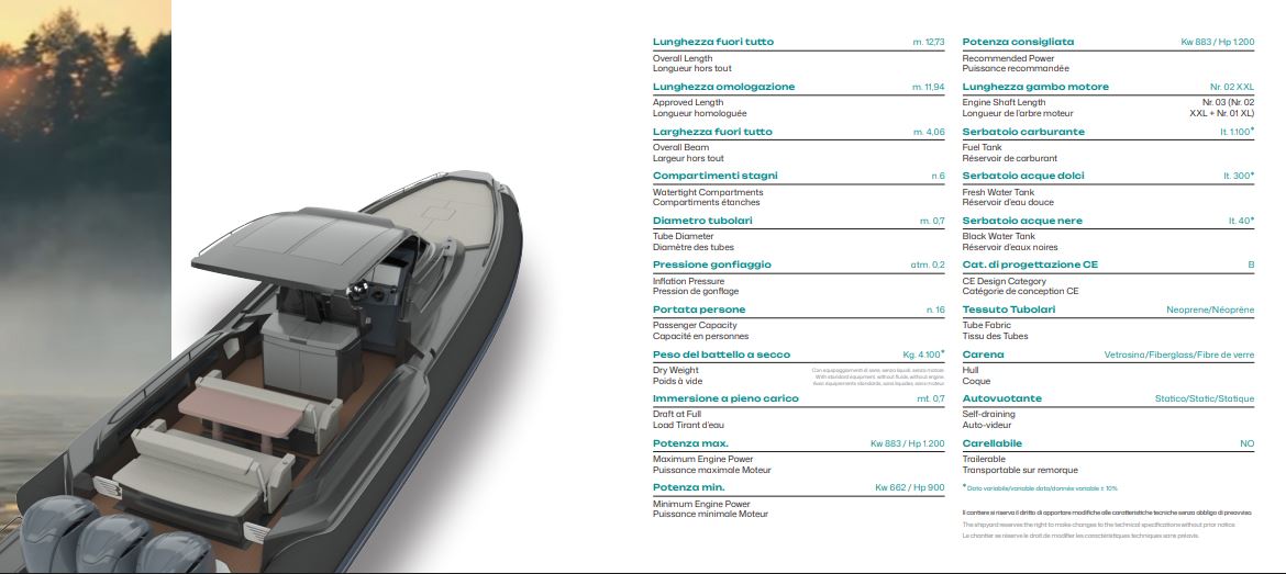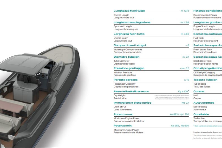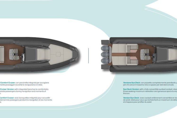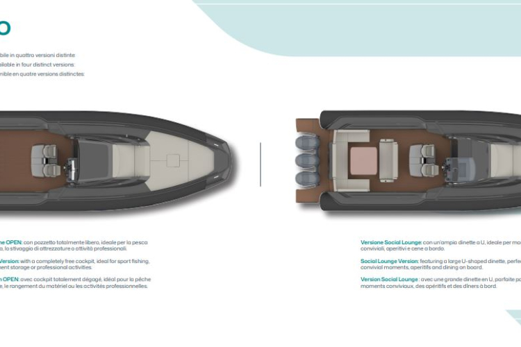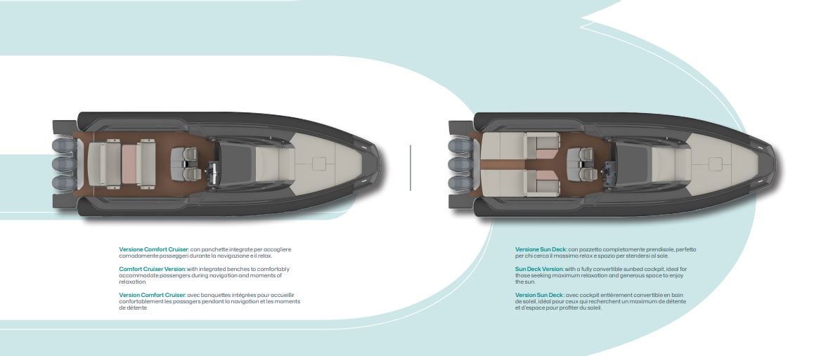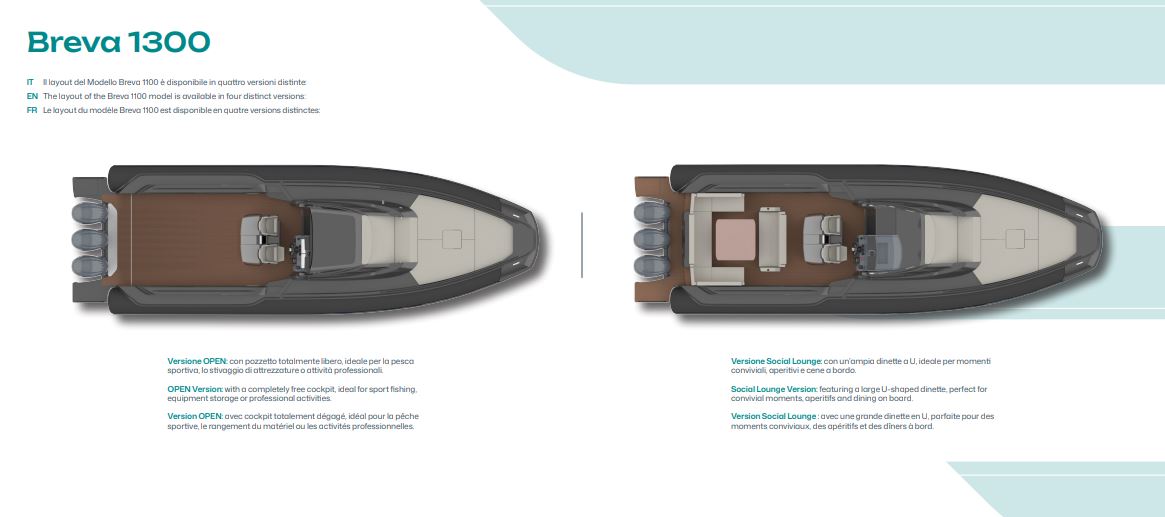 Conçu pour s’adapter à tous les besoins, le Breva 1300 représente l’équilibre parfait entre élégance, fonctionnalité et liberté de configuration. Grâce à un cockpit modulaire innovant, l’aménagement peut être transformé en 4 versions distinctes. Chaque configuration est personnalisable sur demande, grâce à notre bureau de design interne qui travaille en étroite collaboration avec l’armateur pour créer des solutions sur mesure. Sièges, matériaux, aménagements et accessoires peuvent être adaptés aux préférences esthétiques et fonctionnelles du client. Ce 13 mètres n’est pas seulement un semi-rigide : c’est un véritable espace ouvert à vivre, capable de se transformer à chaque fois en ce que vous désirez.
