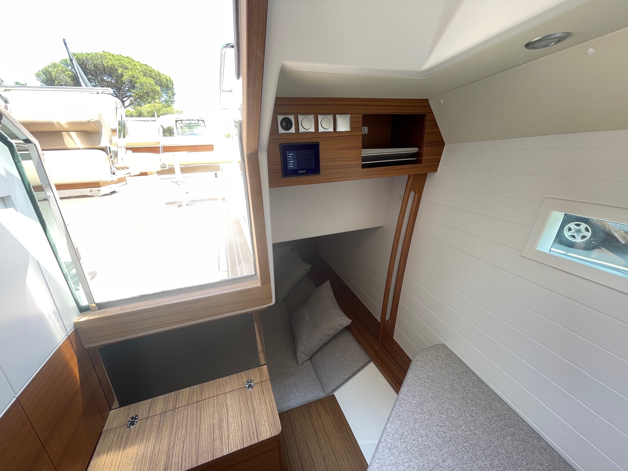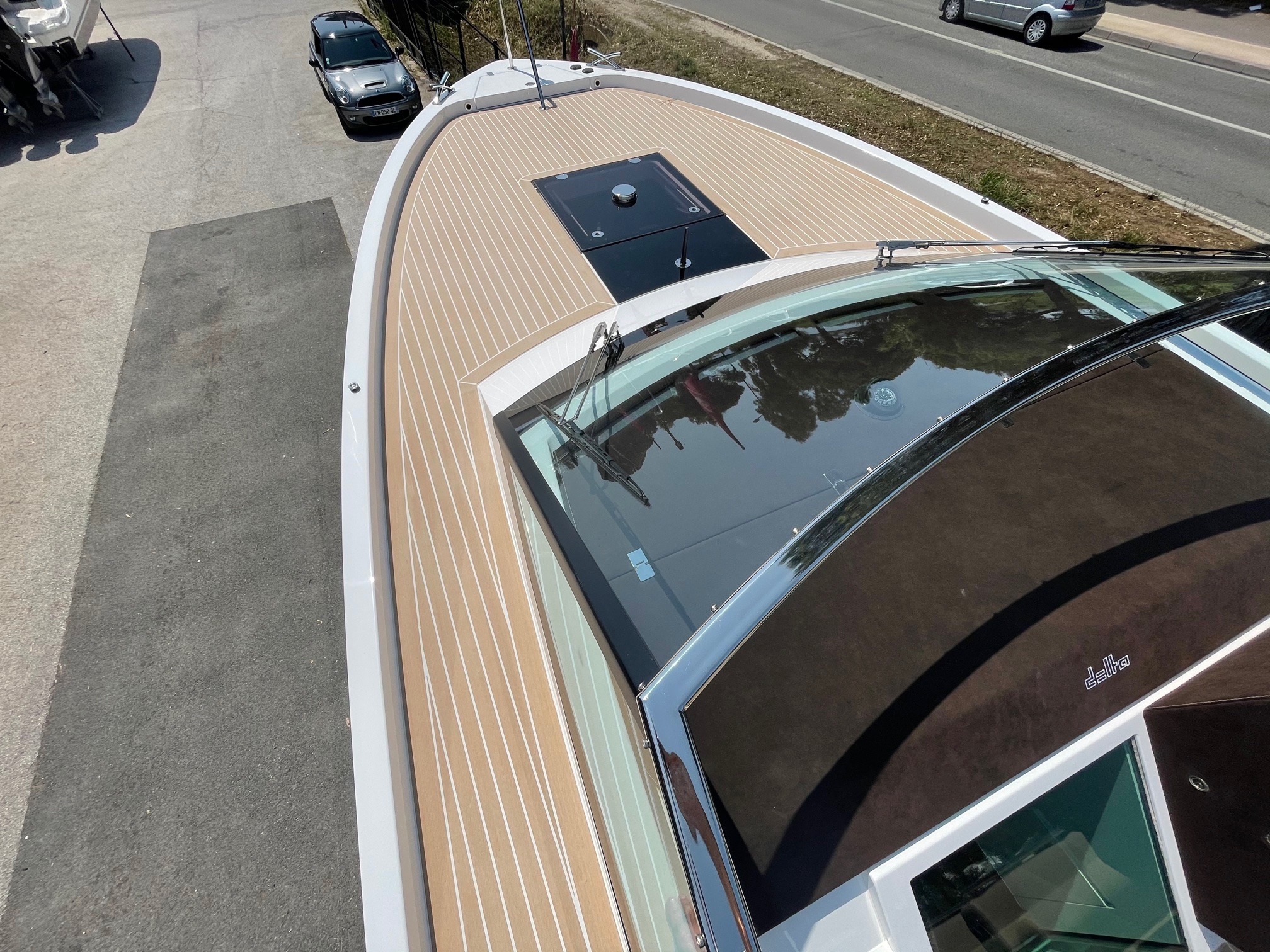 Couleurs : coque blanche, sellerie SILVERTEX beige, joints pont FLEXITECK gris, tauds noirs.