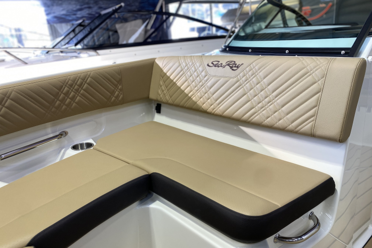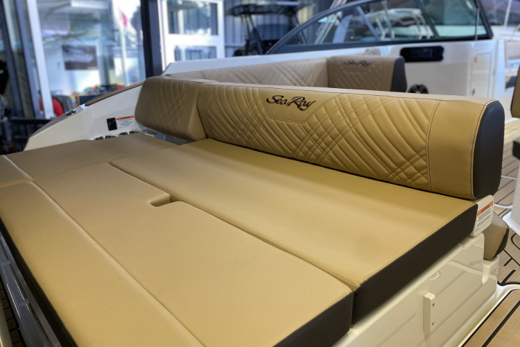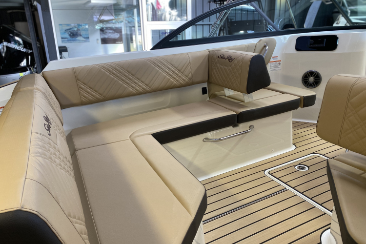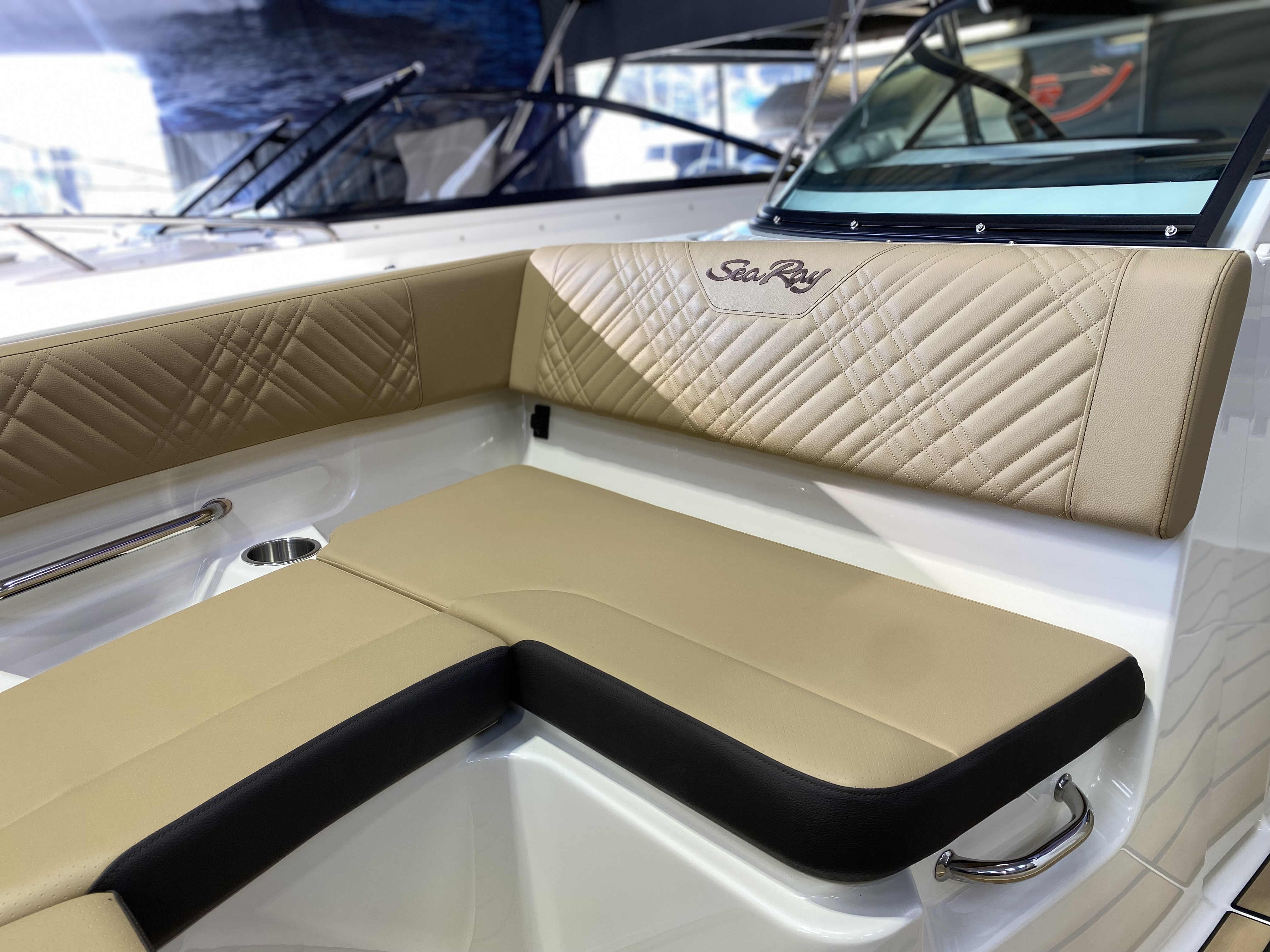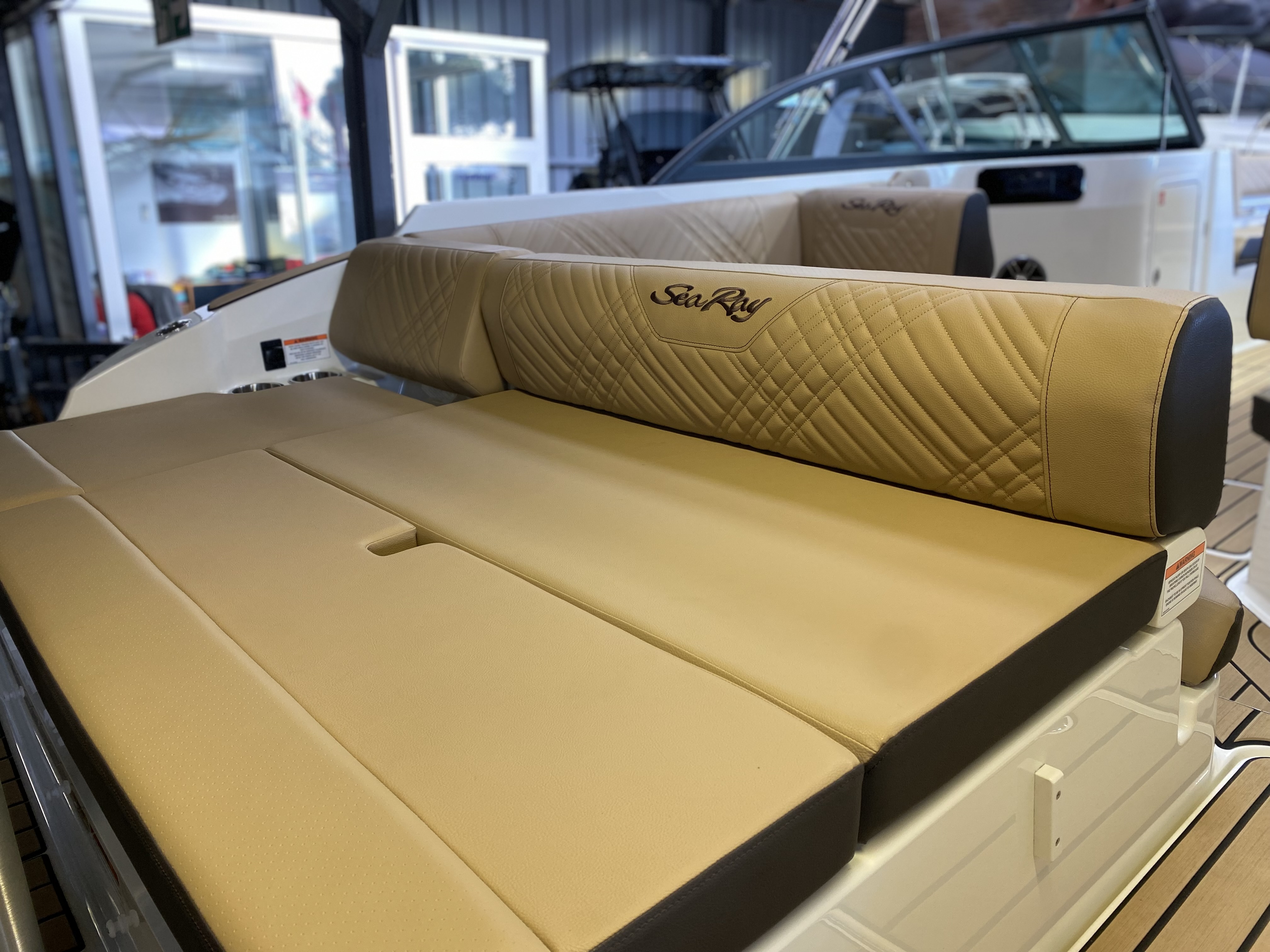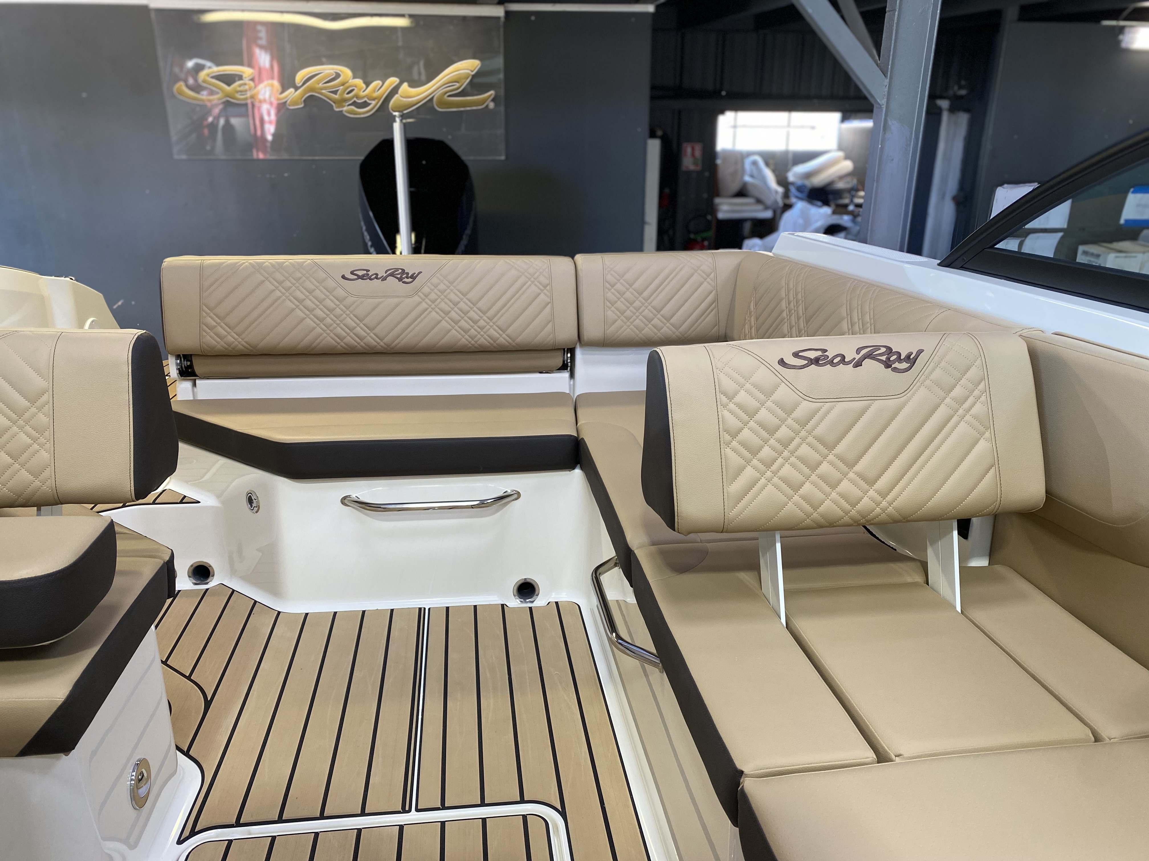 Couleurs : Coque gelcoat gris. Tauds noirs . Sellerie Dune. Revêtement seadeck Mocca