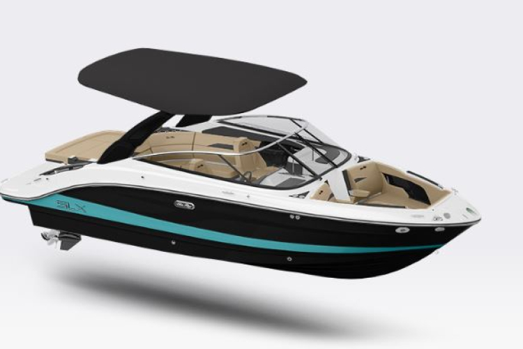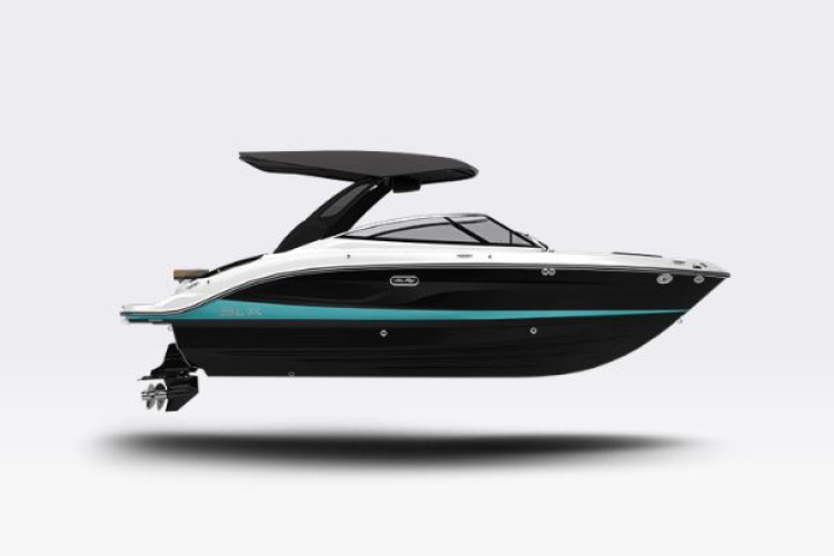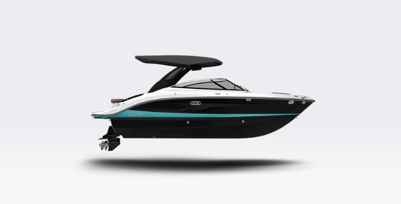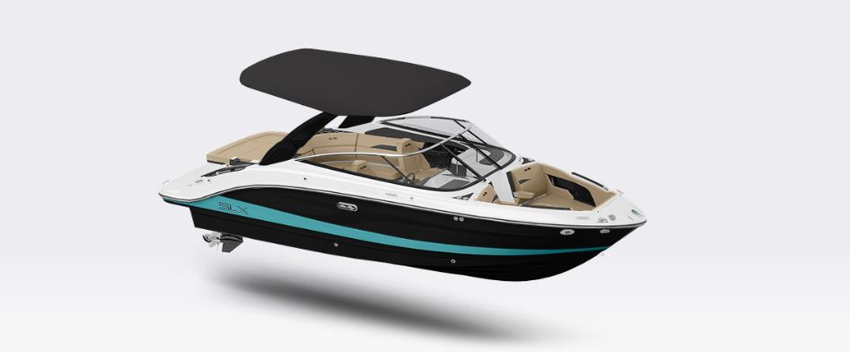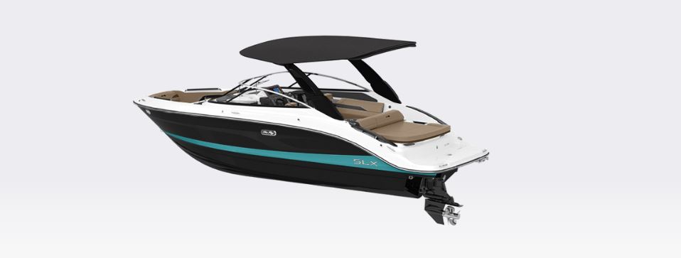 Couleurs : Coque noire. Bande de gel coat Kingfischer Teal (bleu turquoise). Tauds noirs . Sellerie Dune. Revêtement seadeck Mocca