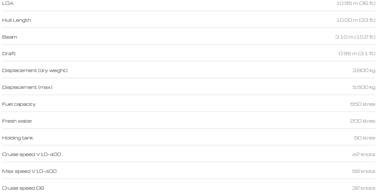 Disponible en version inboard ou hors-bord, le Delta 33 Open peut atteindre une vitesse maximale de 58 nœuds et une vitesse de croisière d'environ 42 nœuds. Grâce à la technologie avancée de sa coque en V profond, il garantit stabilité et économie de carburant, permettant une navigation fluide même par mer agitée.