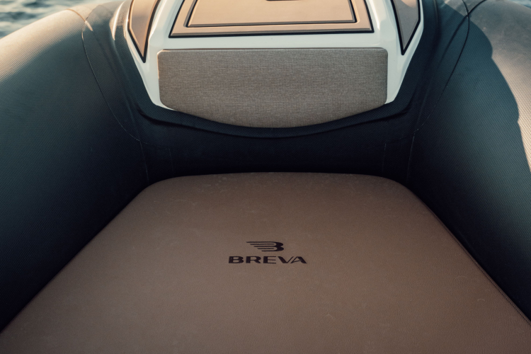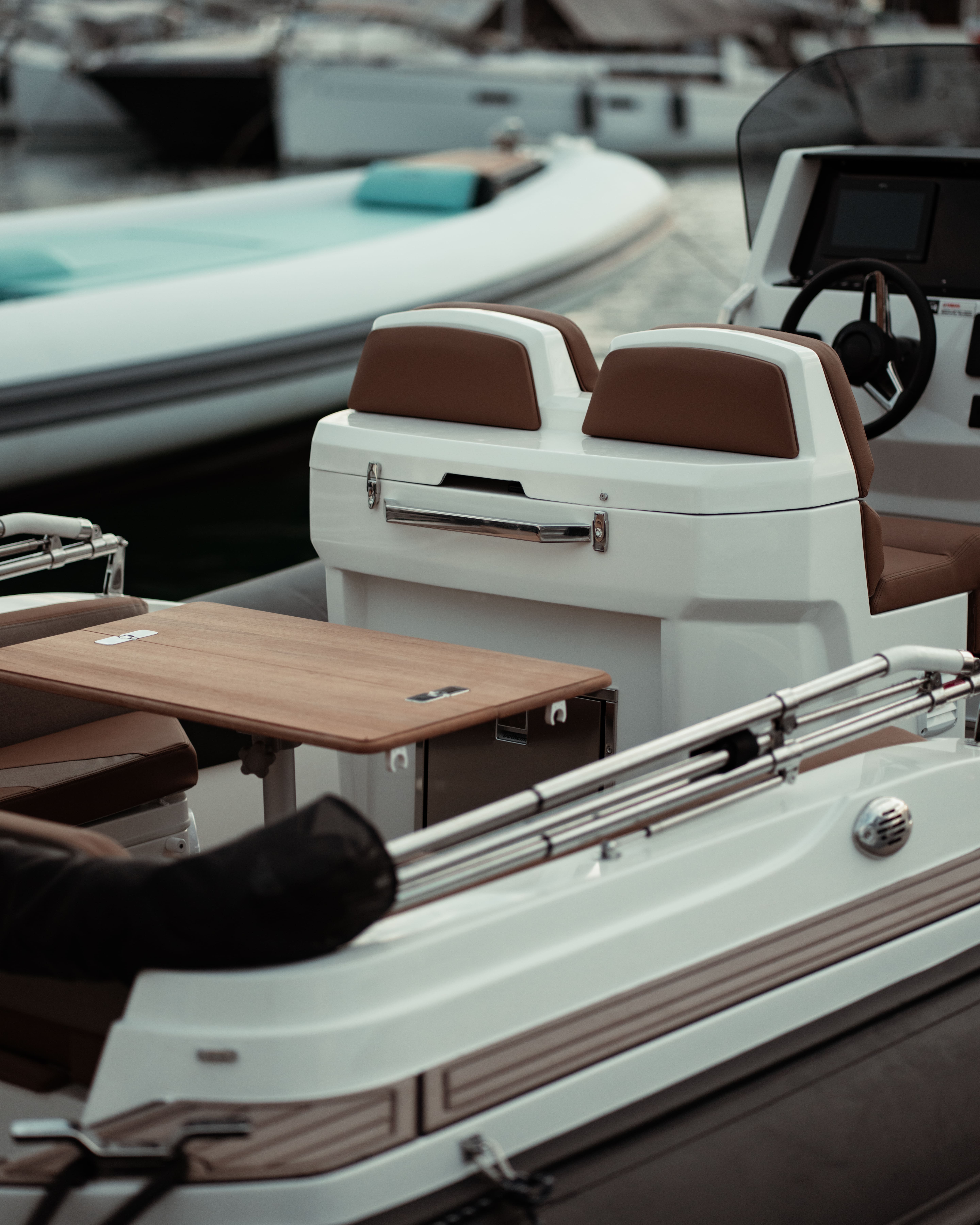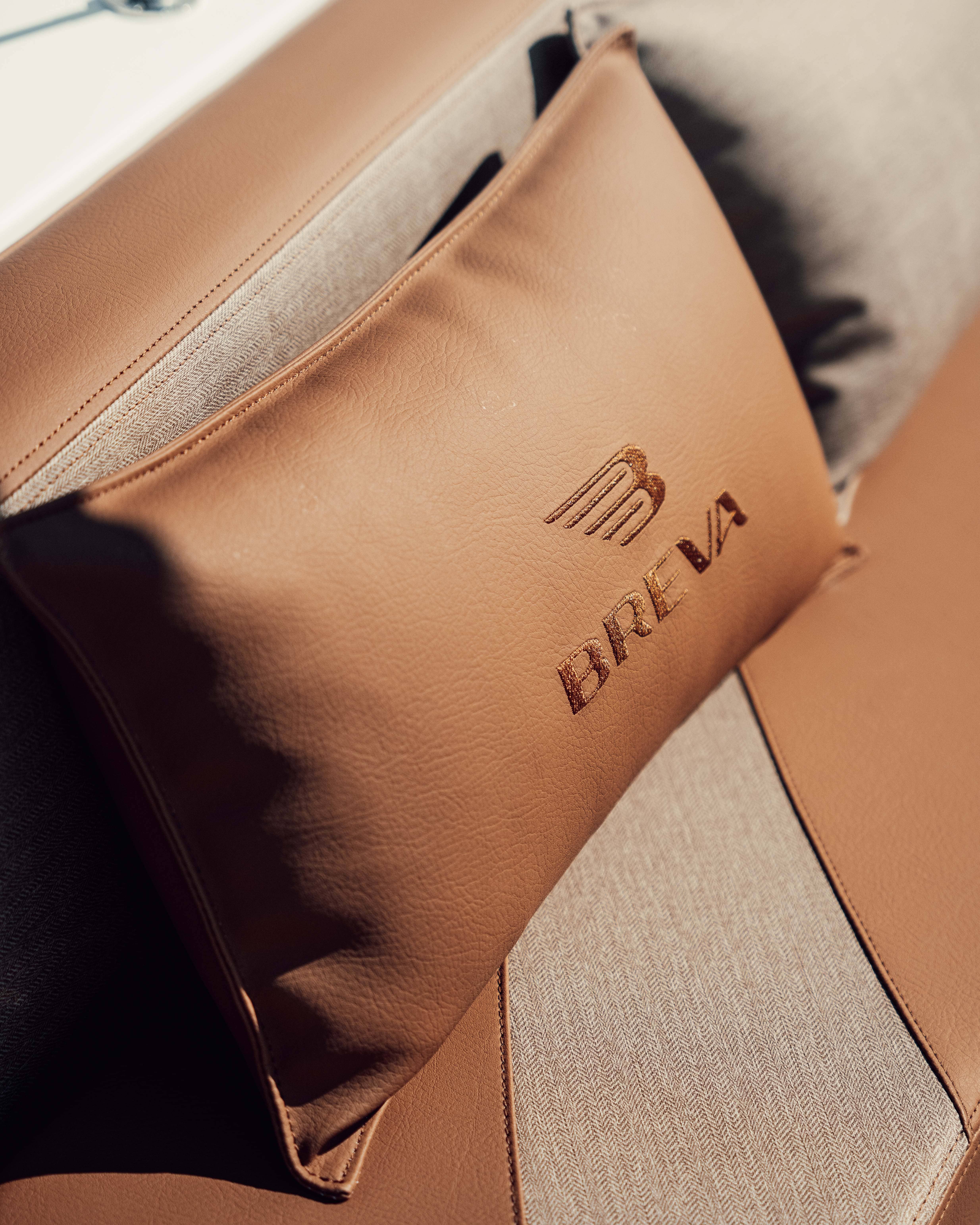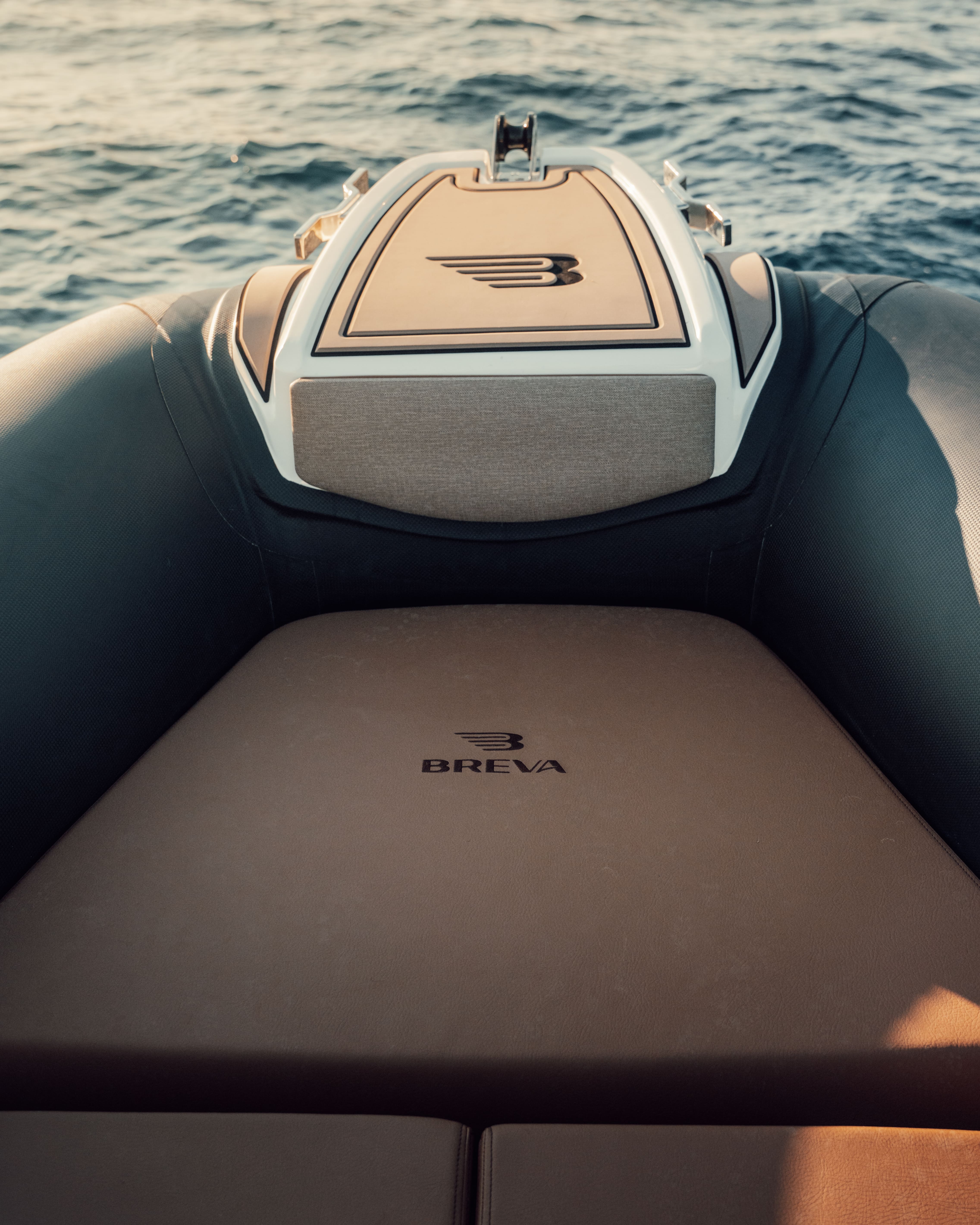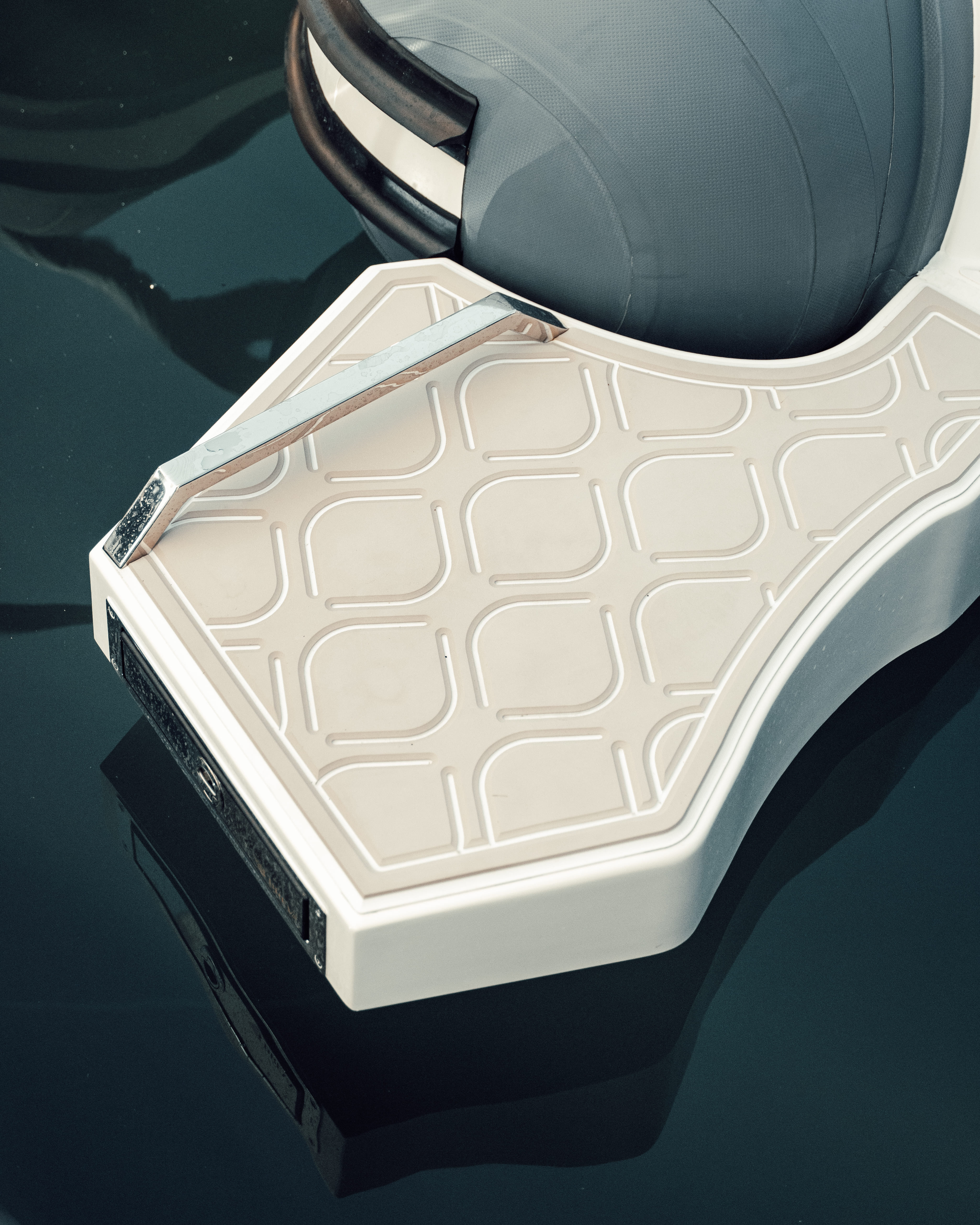 Couleurs : Flotteurs en gris anthracite, logos neptune carbon, pont blanc, carène noire. Coussins Tannery Brandy, décoration de coussin Vestige fennel. Sol synthétique coloris Toffee/Black. Taud de soleil gris anthracite.
