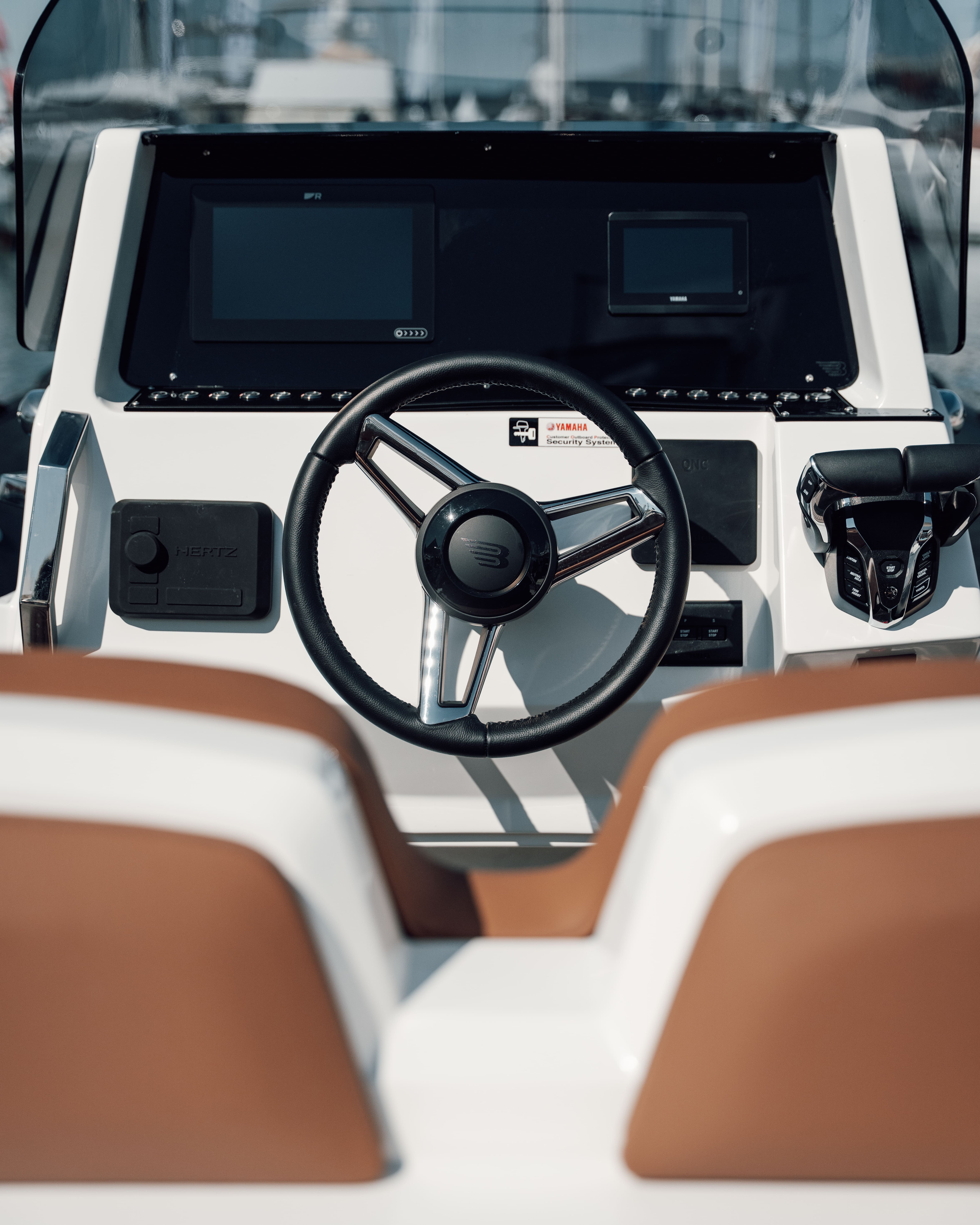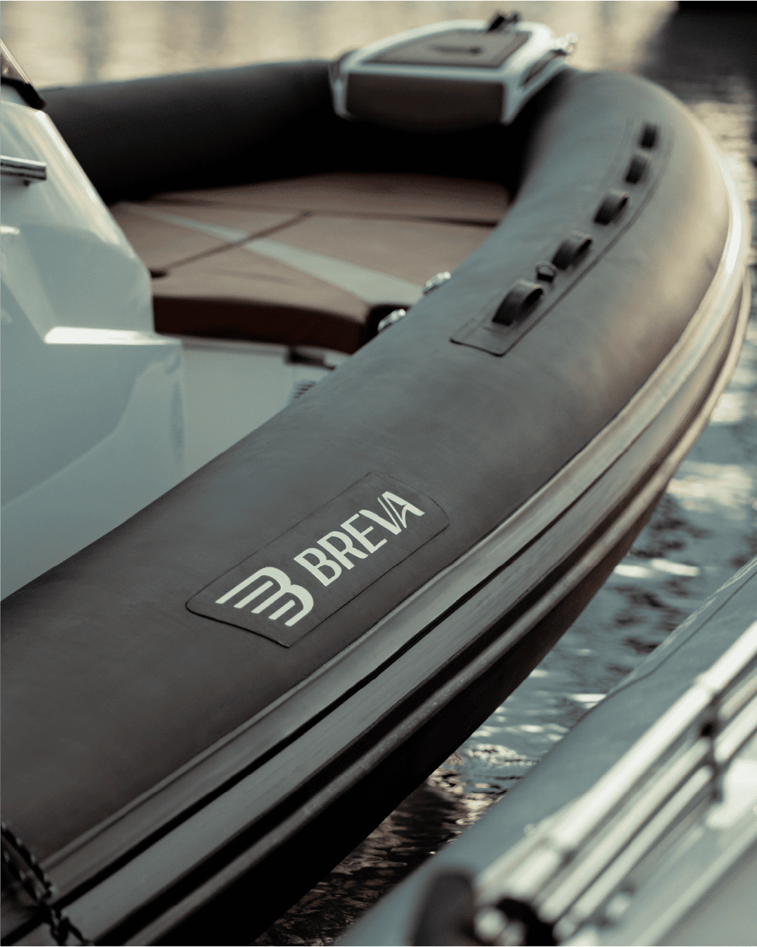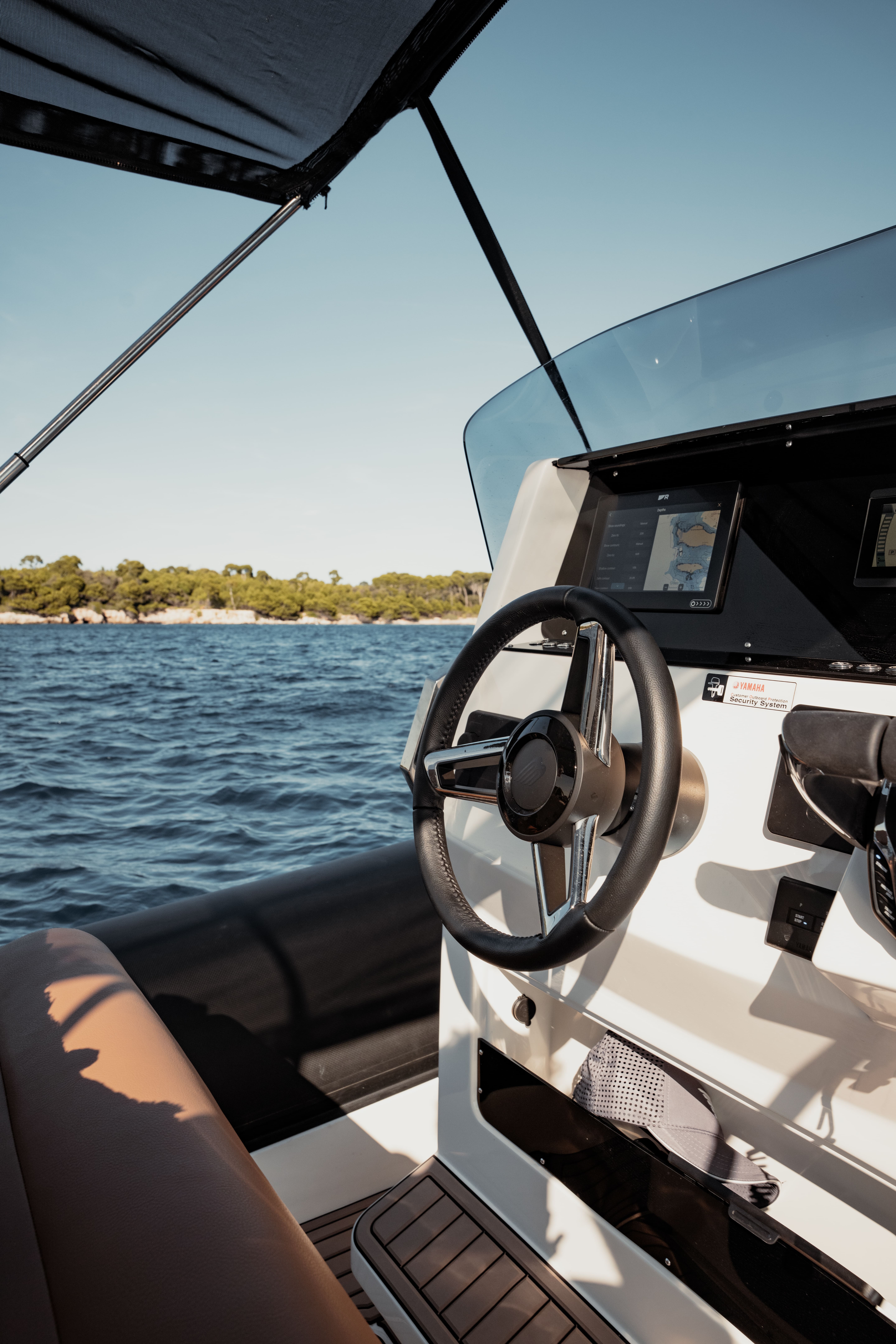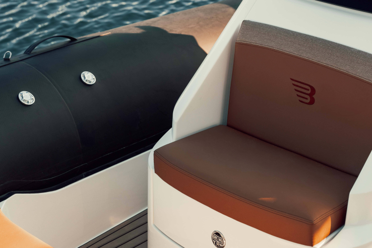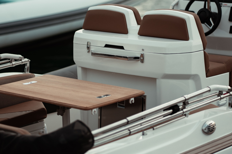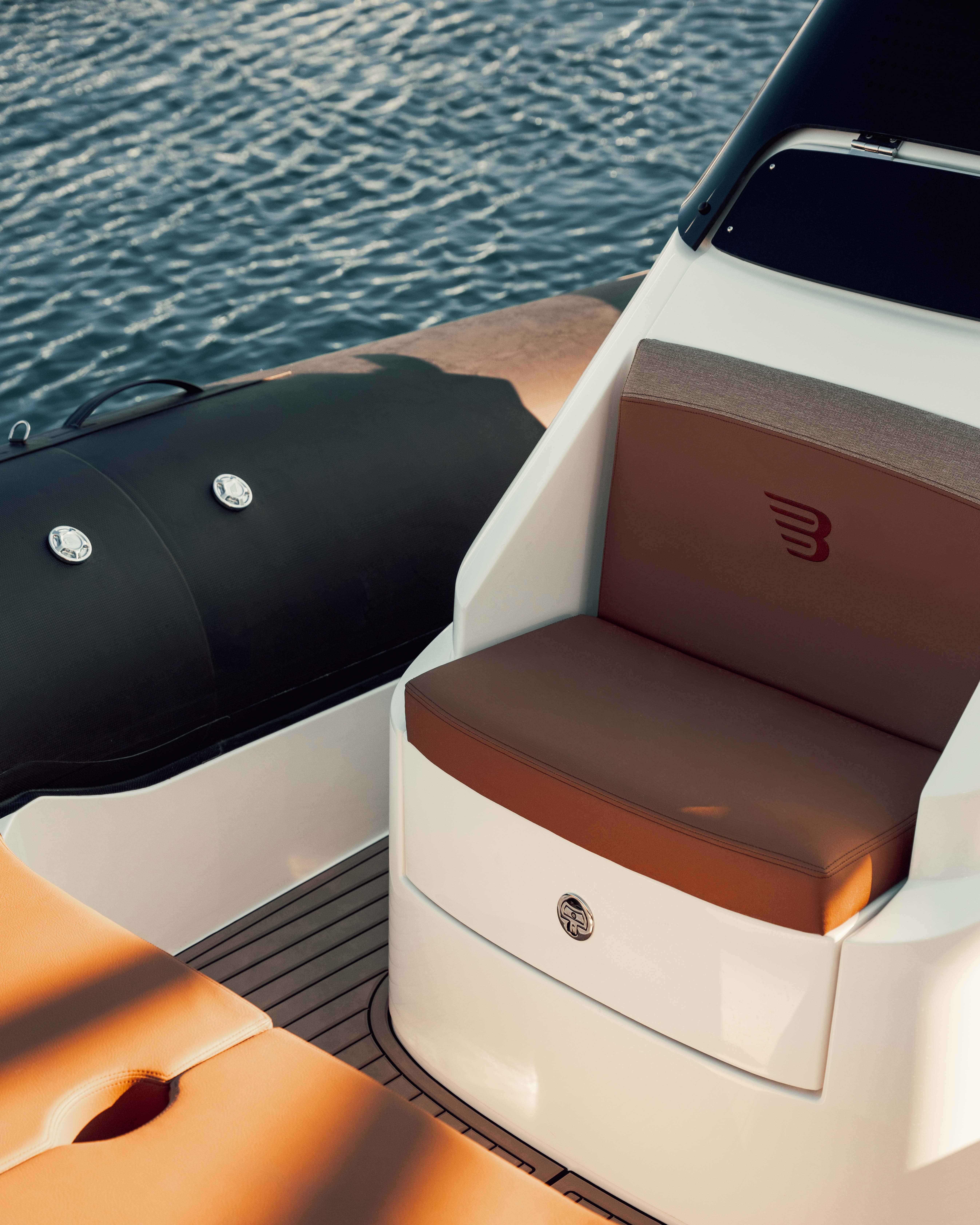 Couleurs : Flotteurs en gris anthracite, logos neptune carbon, pont blanc, carène noire. Coussins Tannery Brandy, décoration de coussin Vestige fennel. Sol synthétique coloris Toffee/Black. Taud de soleil gris anthracite.