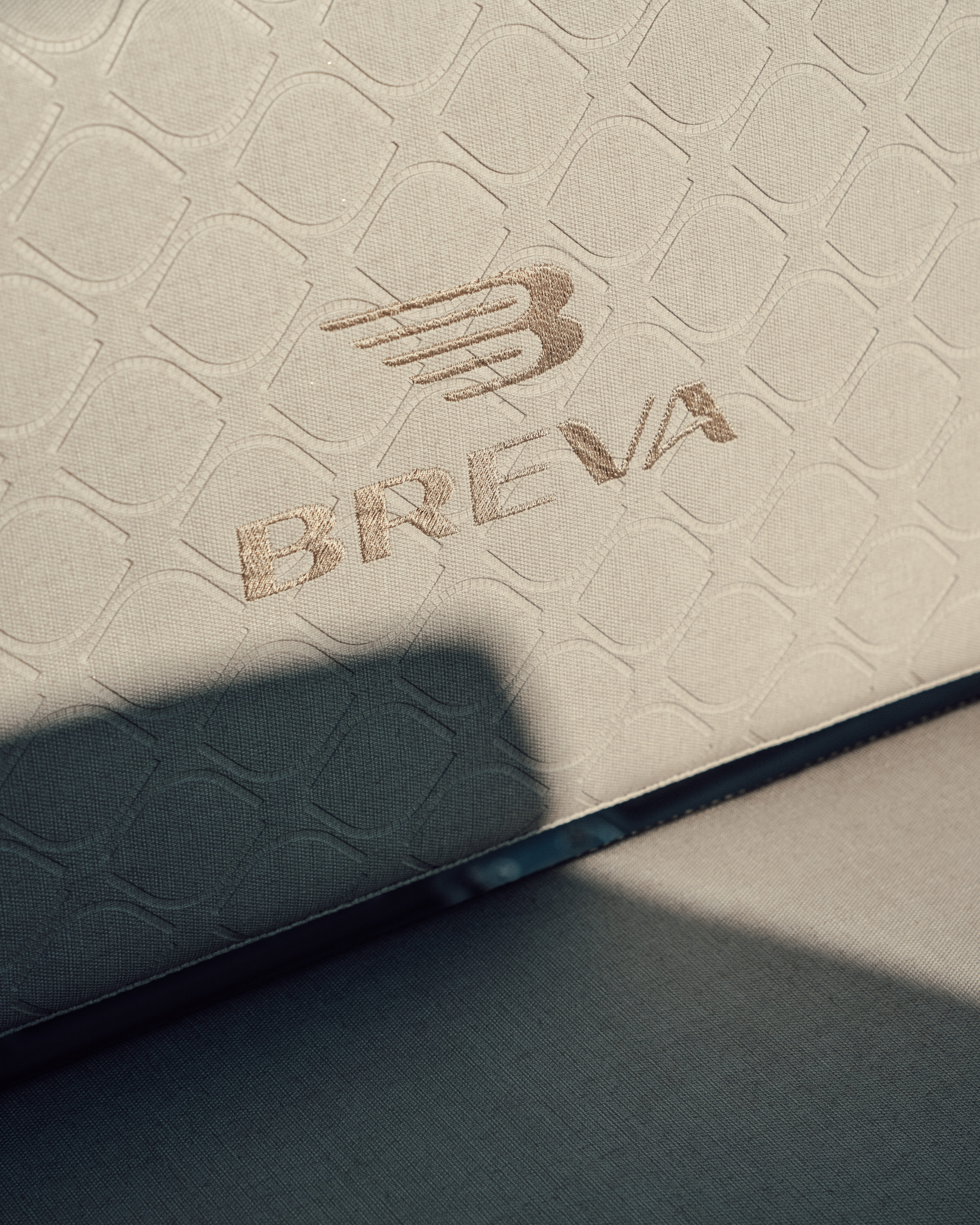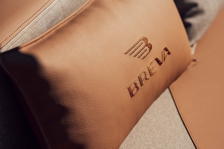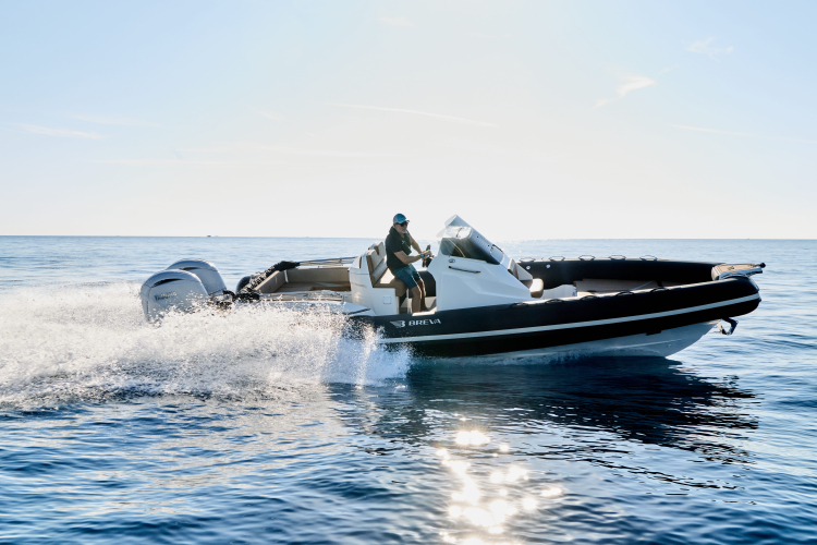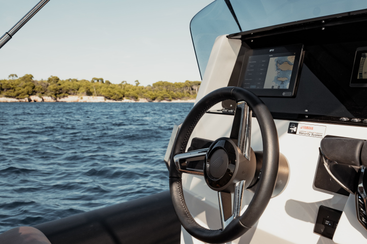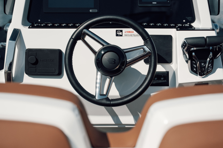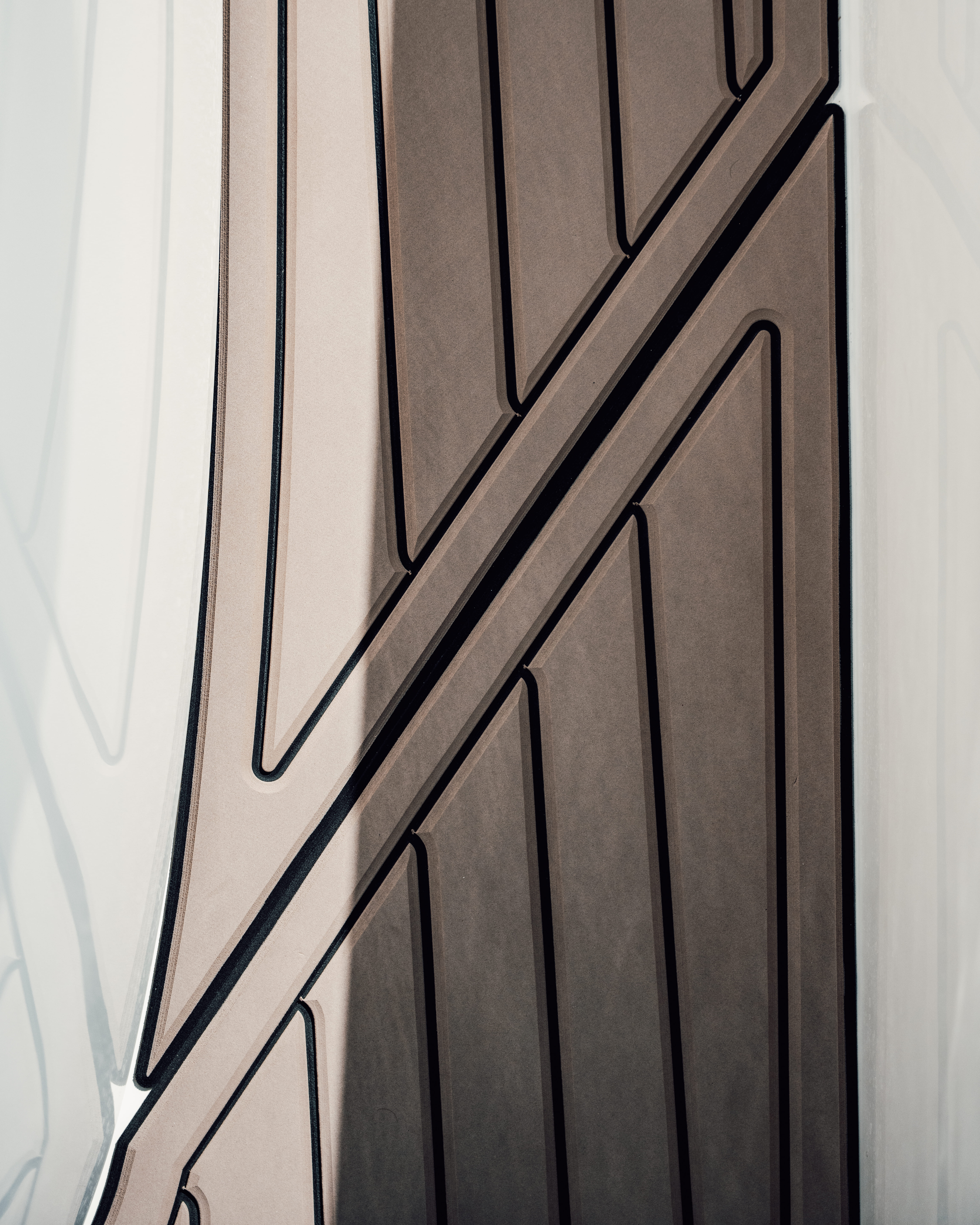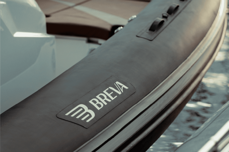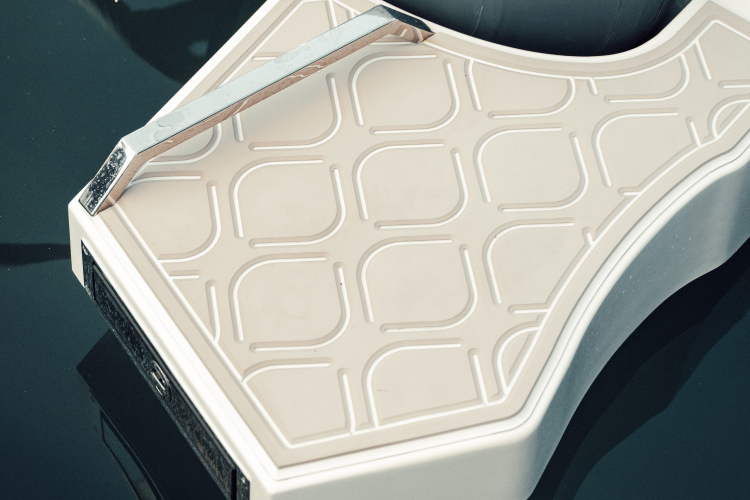 Couleurs : Flotteurs en gris anthracite, logos neptune carbon, pont blanc, carène noire. Coussins Tannery Brandy, décoration de coussin Vestige fennel. Sol synthétique coloris Toffee/Black. Taud de soleil gris anthracite.
