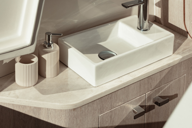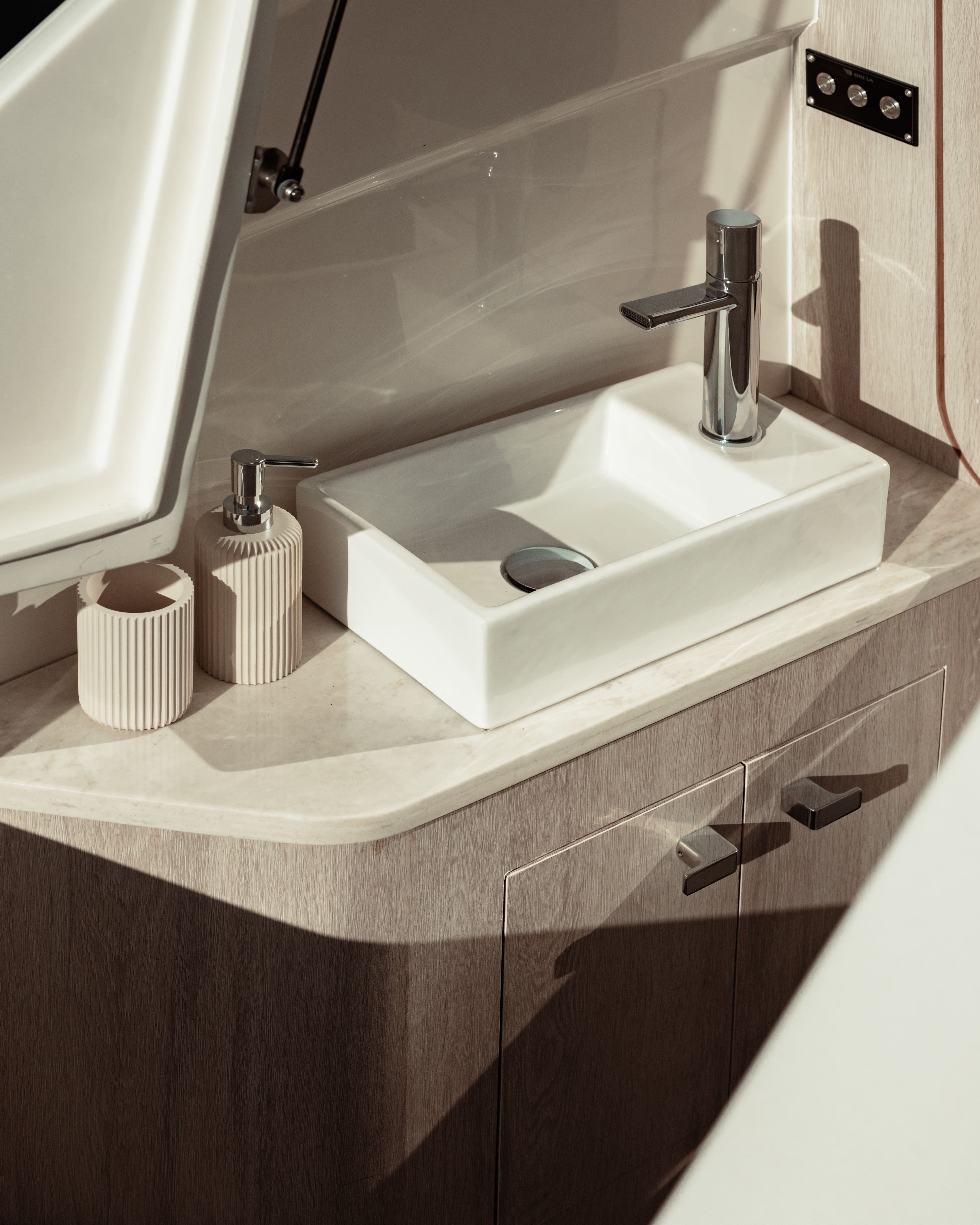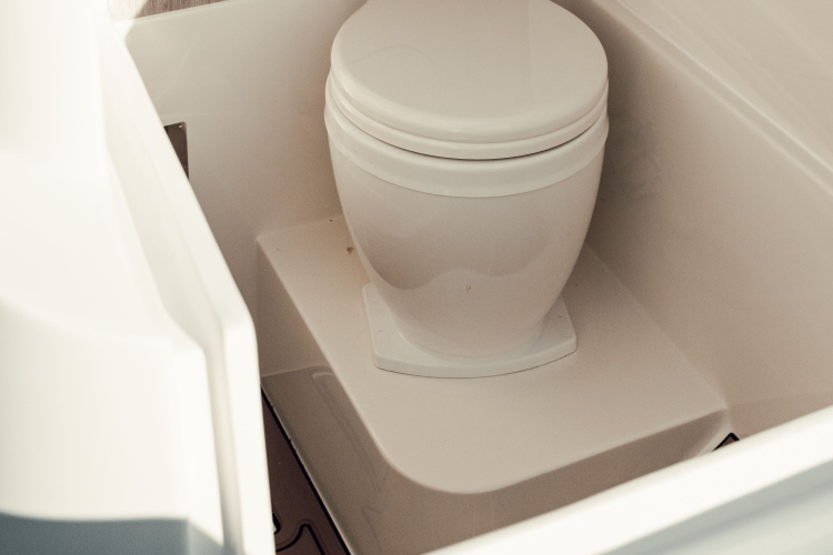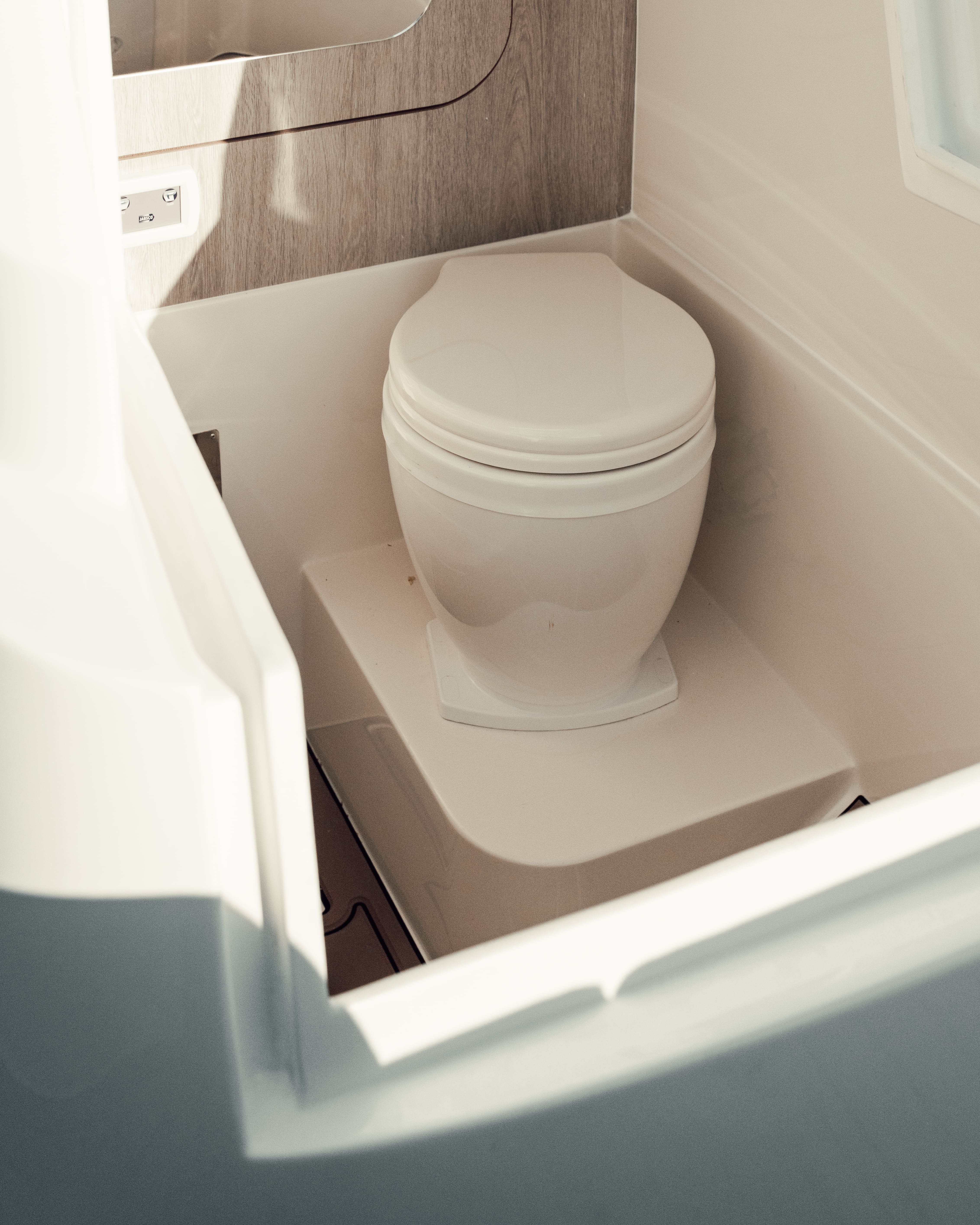 • WC électrique avec réservoir eaux usées et macérateur + lavabo, robinet et produits de toilette