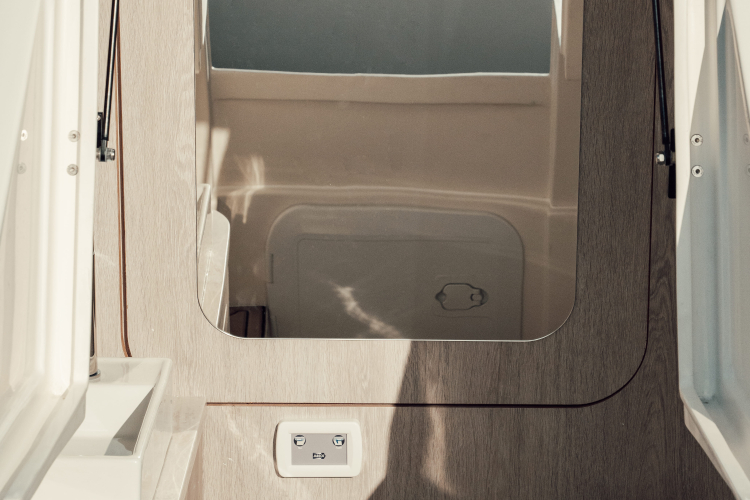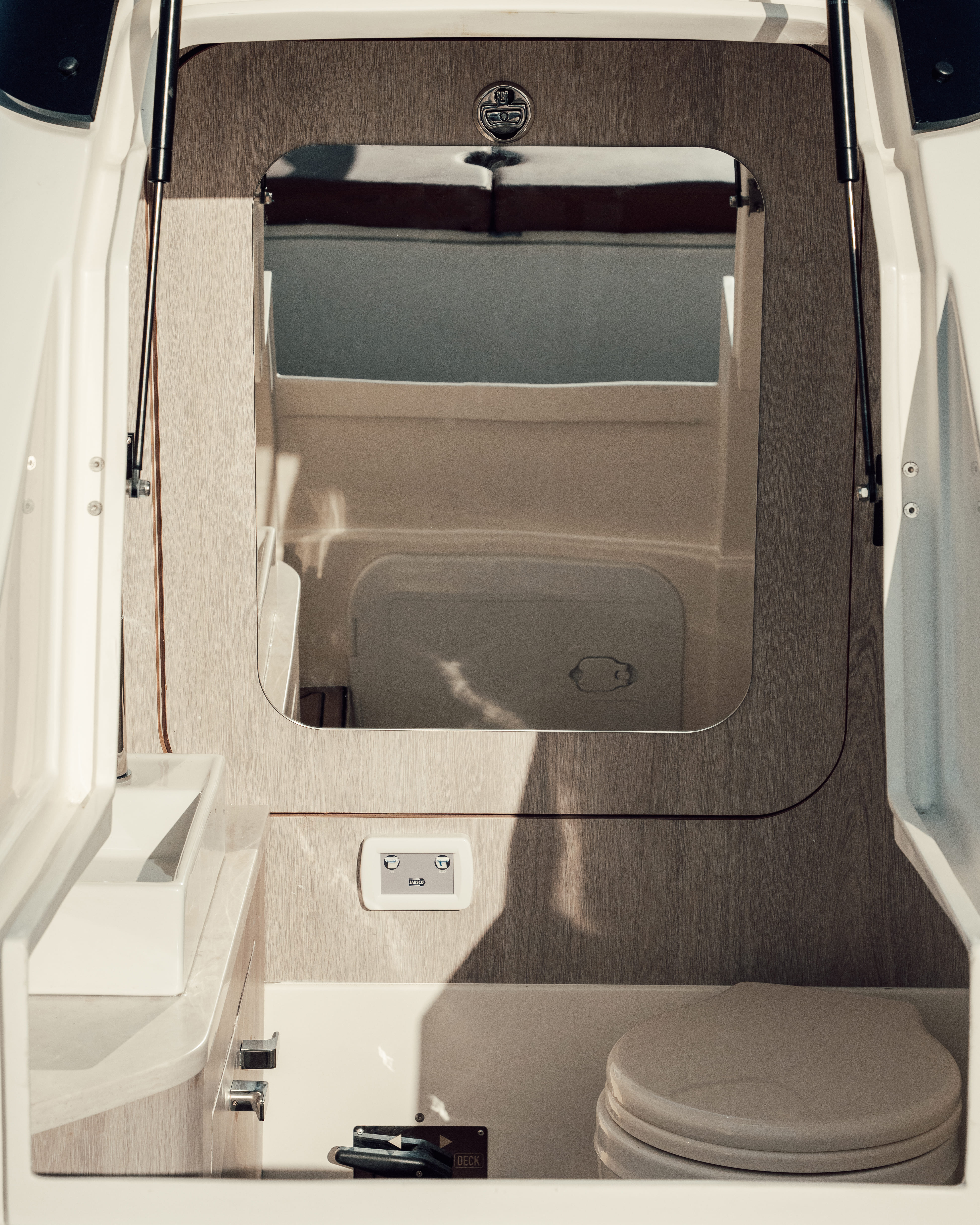 Configuration :  Carré arrière convertible en bain de soleil, console centrale avec WC électrique et lave-main, grand bain de soleil avant