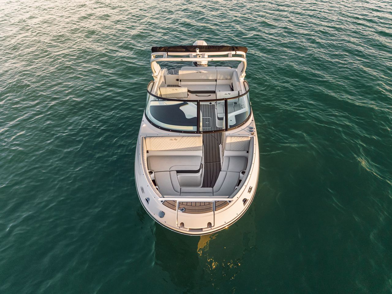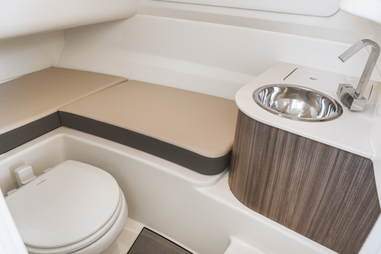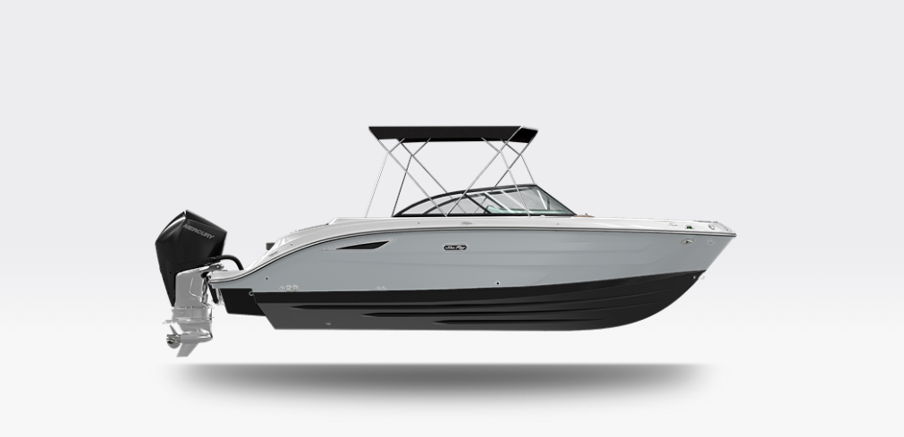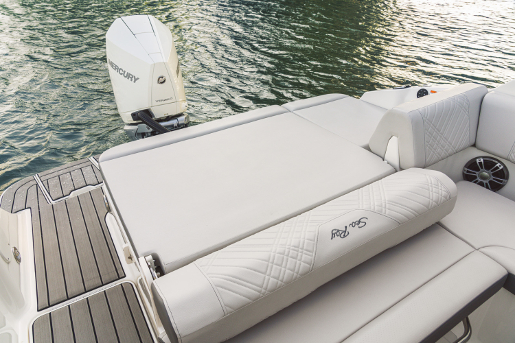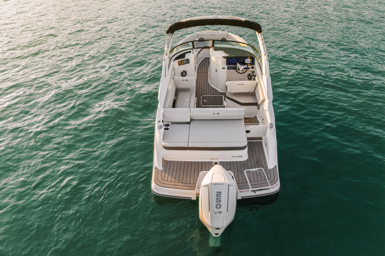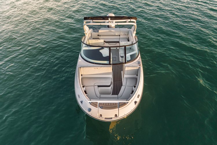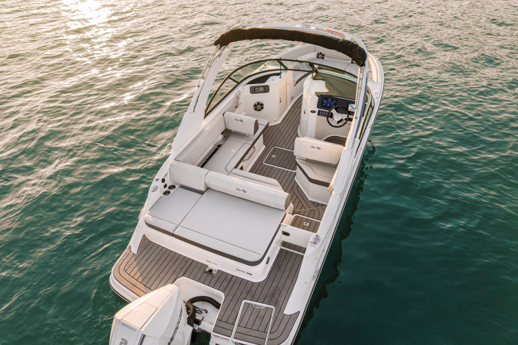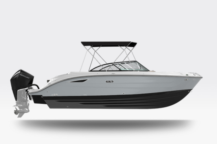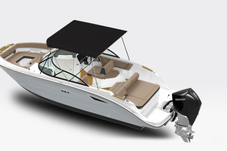 Couleurs : Coque gelcoat gris, bande gel coat Kingfisher Teal (bleu/vert). Tauds noirs . Sellerie Dune. Revêtement seadeck Mocca